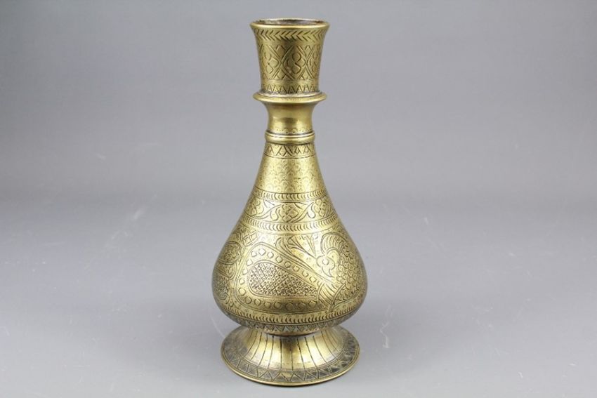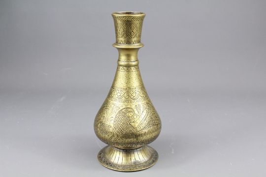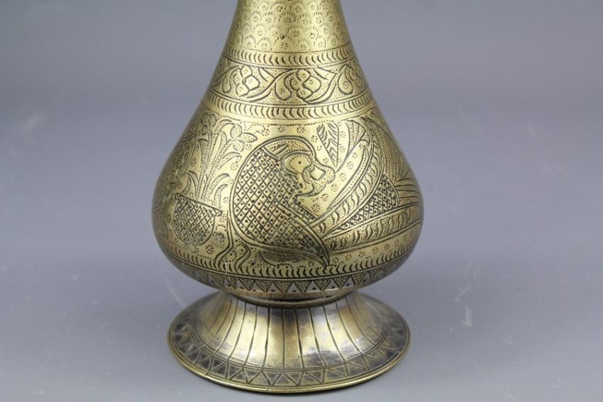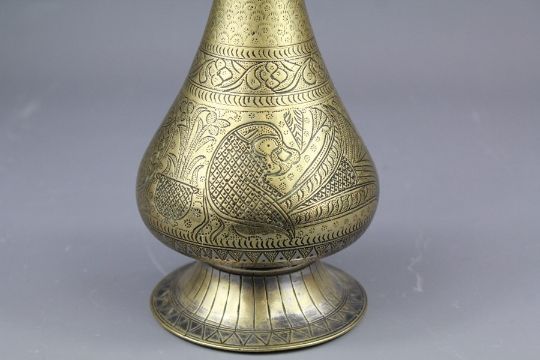 18th Century Islamic Brass Hooka Base, incised with peacock, approx 24 cms.