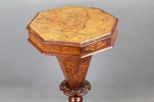 A Victorian Inlaid Sewing Table. The table having central storage cylinder on carved tripod legs, approx 44 dia x 72 h.