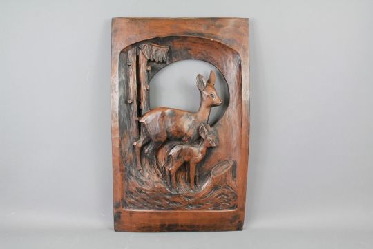 A Carved Panel. The panel depicting a deer and fawn, approx 31 x 50 cms.
