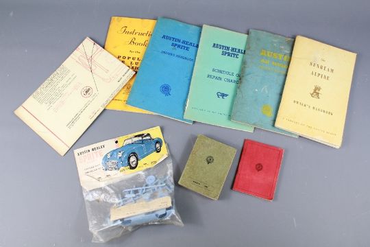 Austin Healey Sprite Mark I 1/32 Scale Model Airfix Kit. The kit with original driver's hand books, schedule of repair charges,  Sunbeam Alpine Owner's Manual  and Lubrication Chart, Austin A35 Hard-body Ford Popular de Luxe Instruction Book March 1939 and 1933 National Used Car Books.