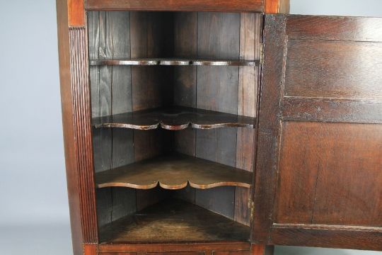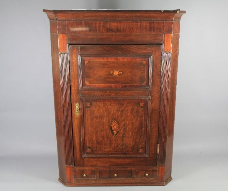 An Antique Oak Corner Cabinet. The cabinet having Sheraton style inlay to front panel, reeded side columns, three shelves, (with two false drawers to either side) approx 80 x 44 x 110 cms.