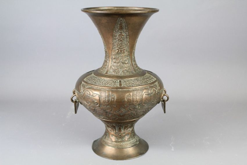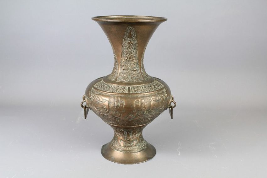 Antique Chinese Bronze Vase. The vase with flared rim with acanthus leaf design, archaic-style decoration with taotie masks and scroll on circular foot, drop handles, approx 29.5 cms h, with character marks to base.