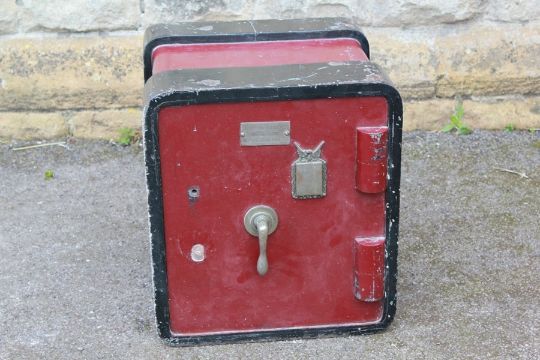 A Williamson Balfour Security Safe. The safe bearing label "Williamson Balfour, Unicas Ajentes, Valparaiso Concepcion ETC", painted red and black and measuring approx 41.5 x 46 x 38 cms.