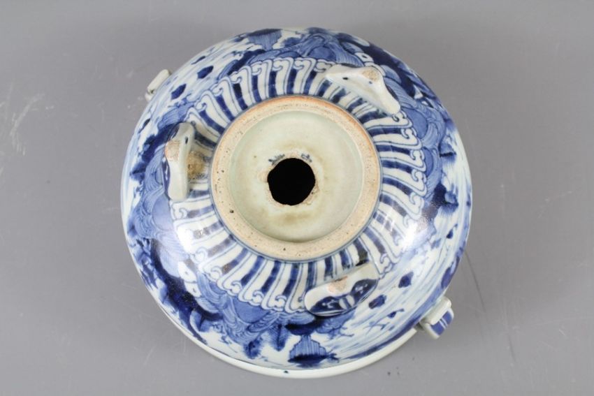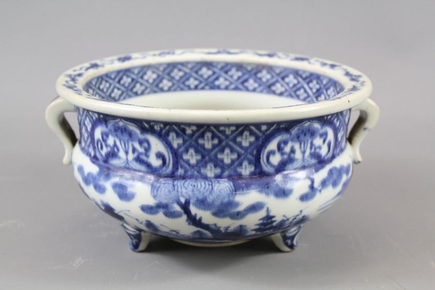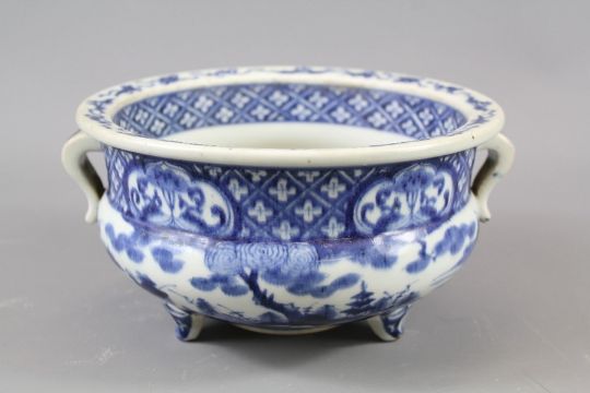 An Antique Chinese Blue and White Censer. The censer painted with landscape and Buddhist symbols, twin handles and raised on three feet, approx 12 x 20 cms (the base has been drilled thus removing the character marks to base)
