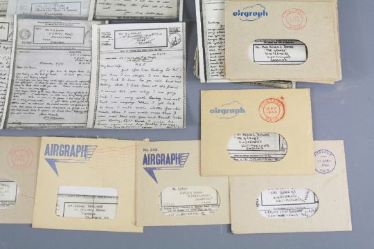 WWII Airgraphs. This lot comprises 73 WWII Airgraphs, including six in their original envelopes dated from 1941-1944, plus another five empty envelopes.Note: Airgraph forms, upon which a letter was written, were photographed and then sent as negatives on rolls of microfilm.