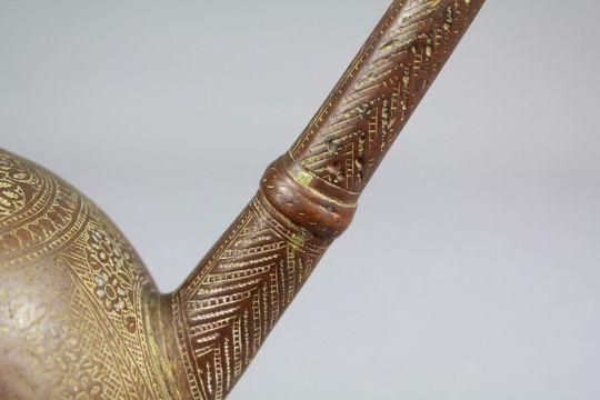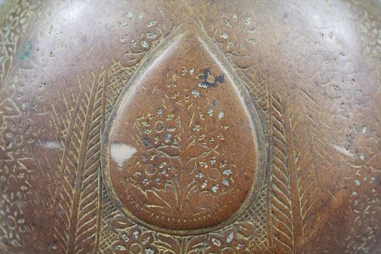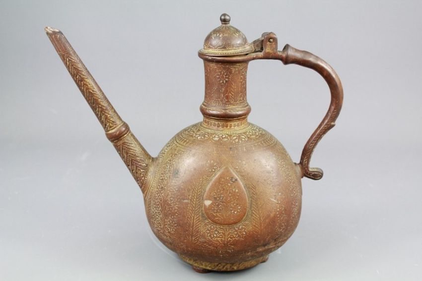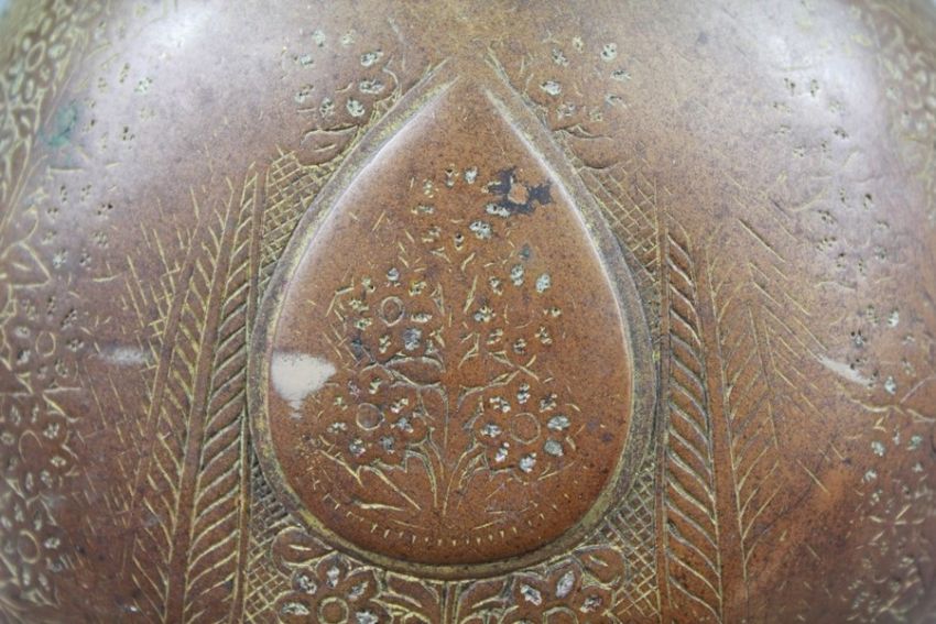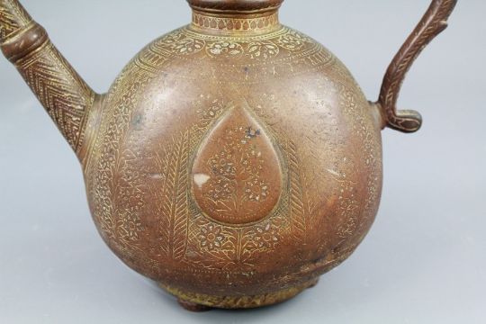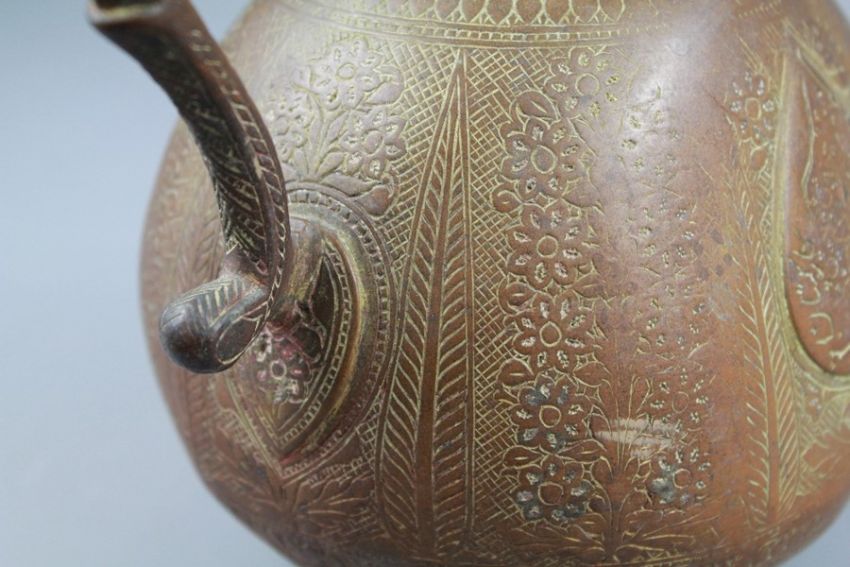 17th Century Mughal Bronze Ewer (possibly Lahor). Finely engraved with arabesque and scrolling vine, hinged cover, with a teardrop cartouche, Arabic character marks to foot, approx 24 cms.