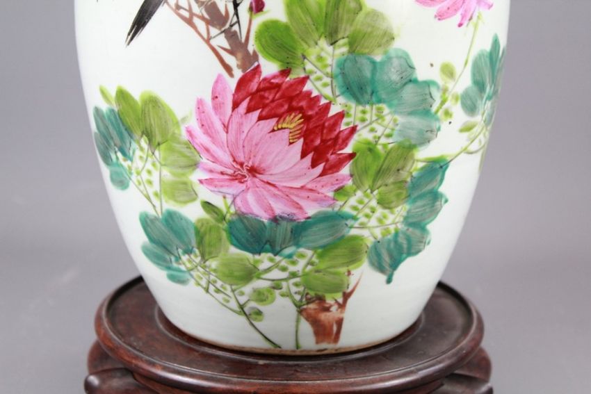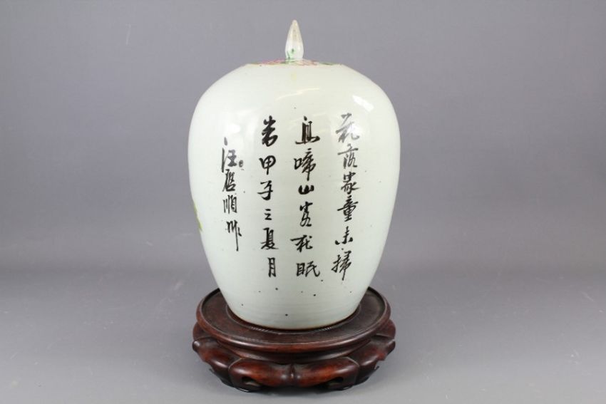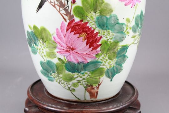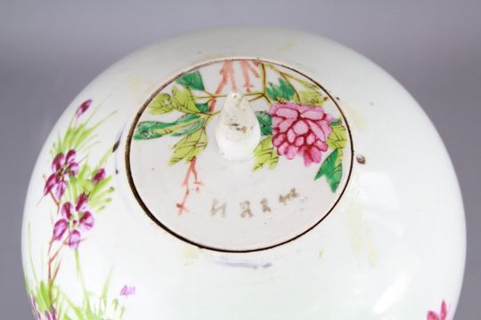 A Chinese Early 19th Century Famile Rose Ginger Jar and Cover. The jar painted with a bird amongst peony and an inscription to vase body (see image), approx 26 cms h.
