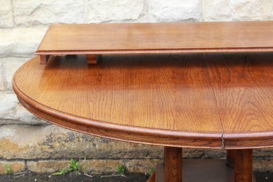 A Quality Solid Oak Oval Extending Dining Table. The table with four turned columns terminating on heavy splade legs, approx 80h x 125 cms together with an extending leaf 130 x 45 cms.