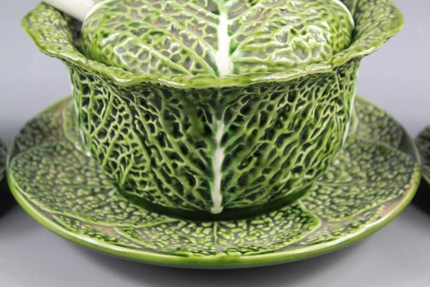 A Quantity of Portuguese Cabbage Ware. This lot includes a tureen and cover, jam pot and cover, six dinner plates, six fish plates, six small plates, five pale green plates, six bowls, six serving side dishes, seven bowls, four cups and saucers, sauce boat, three olive dishes, five pale green side plates and a hors d' oeuvre dish, in the style of Bordallo Pinheiro.