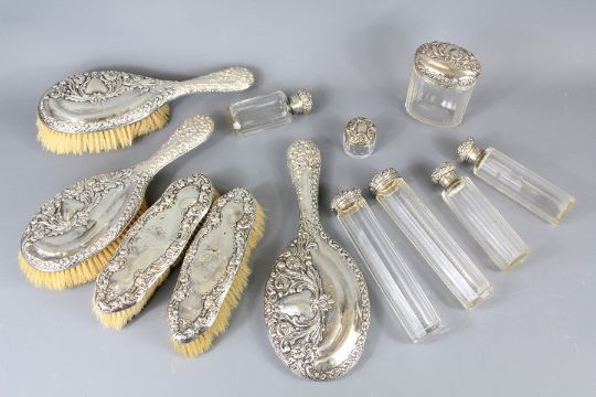 An Edwardian Twelve Piece Silver Dressing Table Set. The set comprising mirror, two clothes brush, two hair brushes, six cut-glass and silver-topped bottles, various hallmarks.