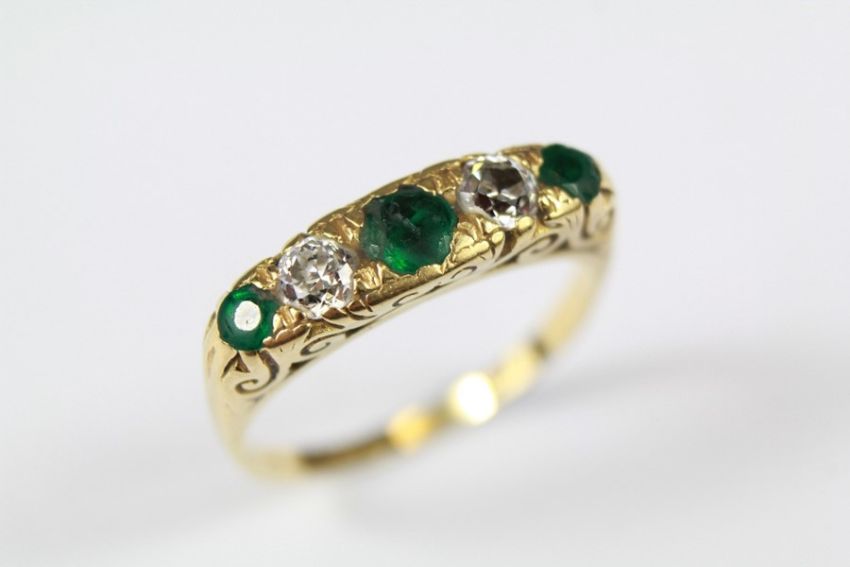 Antique 18ct Yellow Gold, Emerald and Diamond Ring, size Q, approx 4.2 gms, 2 x 25pts of old-cut dias, emeralds very worn.
