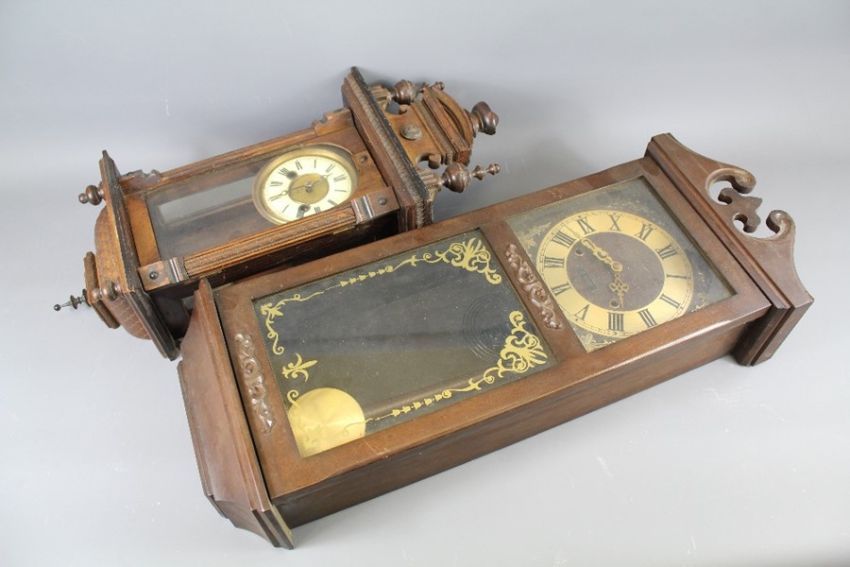 Two Wall Clocks. The first having carved columns to either side, Roman numerals, decorative top and bottom, approx 61 x 25 cms; the second having a gold face with decorative gold paint to glass, 31-day movement, approx 70 x 27 cms.  (2)