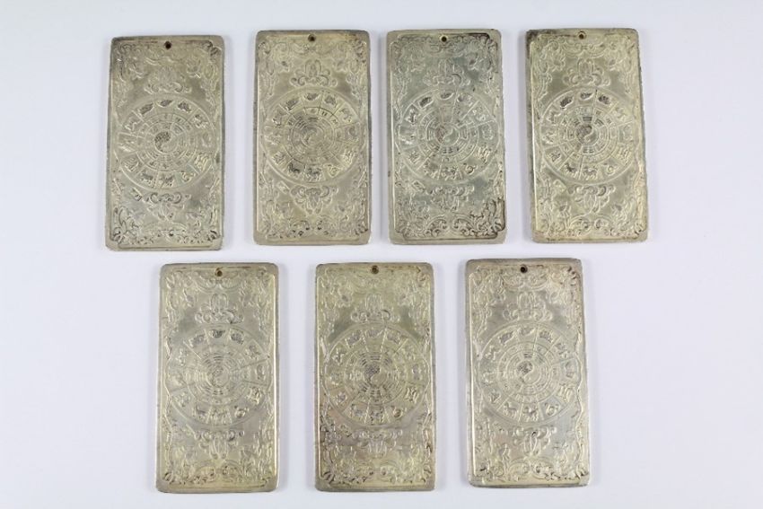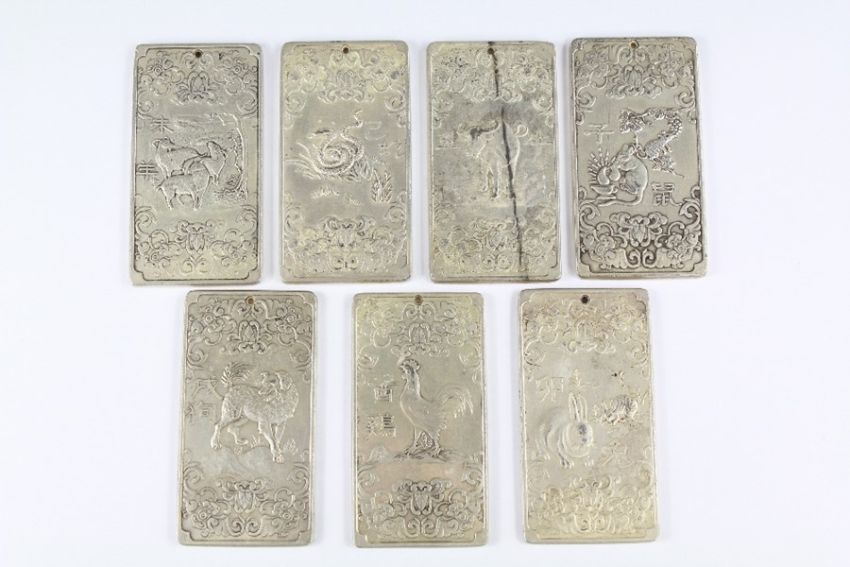 Seven Chinese Silver-Metal Scroll Weights, embossed decoration depicting the Chinese horoscope and the animals of the Zodiac.