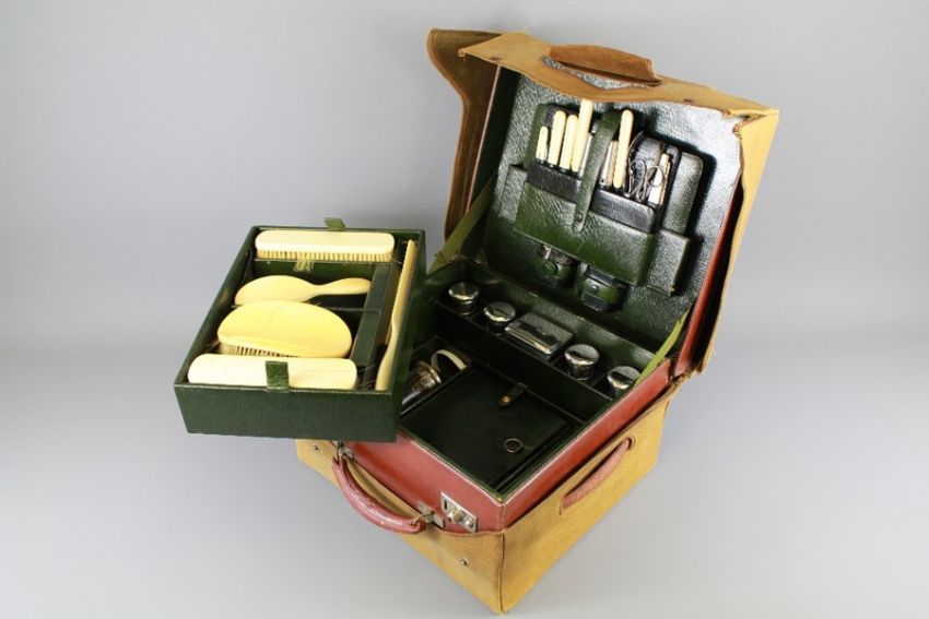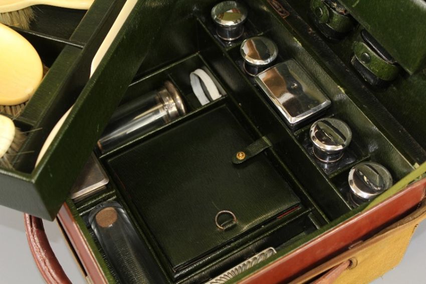 Note: This dressing case originally belonged to the Petit Baronets of India. A notable and industrious family who established the first textile mills in India. It is believed to have belonged to the second Baronet Dinshaw Petit (1873-1933.) Parsi entrepreneur and second son of Sir Dinshaw Maneckji Petit (1823-1901), this vanity case has remained with the family until now.