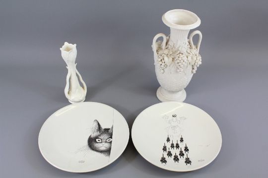 Antique Parian Bisque Vase with applied grape and vine decoration, approx 31 cms h together with white porcelain tulip vase and two Dubout feline plates. (4)