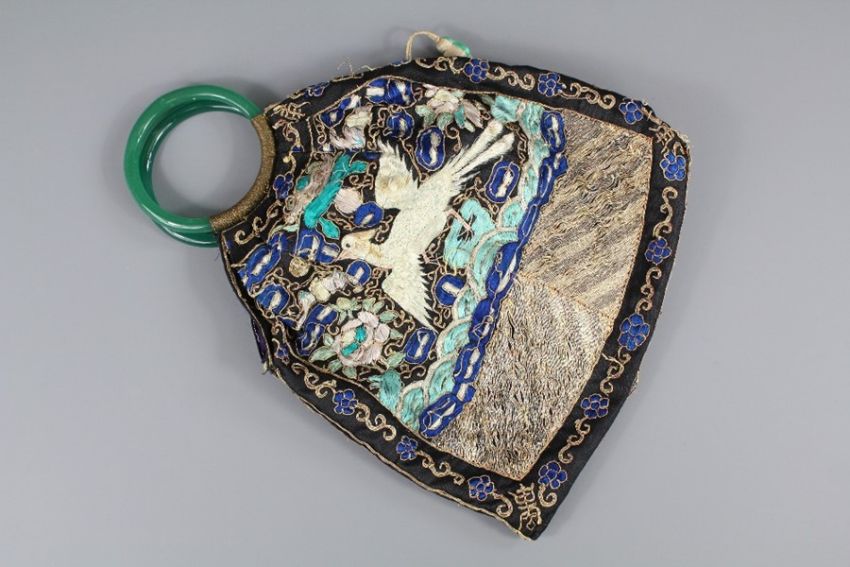 A Chinese Silk Embroidered Bag. The bag with handle double circular handle of green jade-effect glass, approx 32 x 25 cms, embroidered with a bird and heightened with gilt thread.
