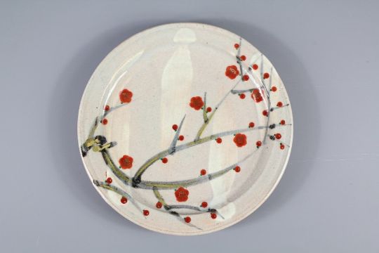 A Japanese "Mino-yaki" Plaque. The plaque approx 26 cms dia., depicting cherry blossom with certificate and box.