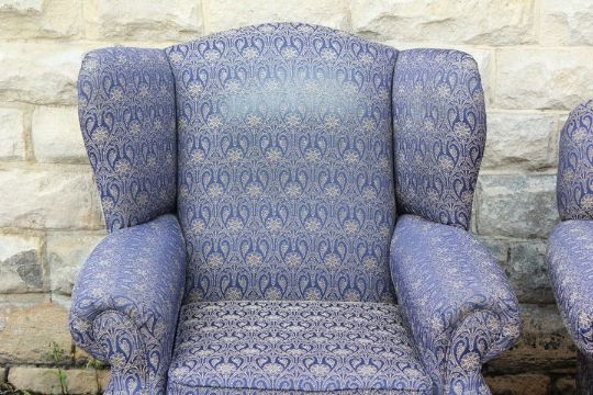A Living Room Suite. This suite comprises a sofa with cobalt blue Liberty-style upholstery together with an armchair and a matching wing-back chair.