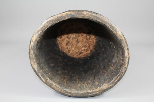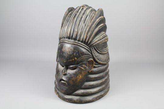 An Antique Mende Sowei African Helmet Mask. The mask carved from a single piece of wood into a domed design with elaborate headdress, light in weight, approx 35 cms.