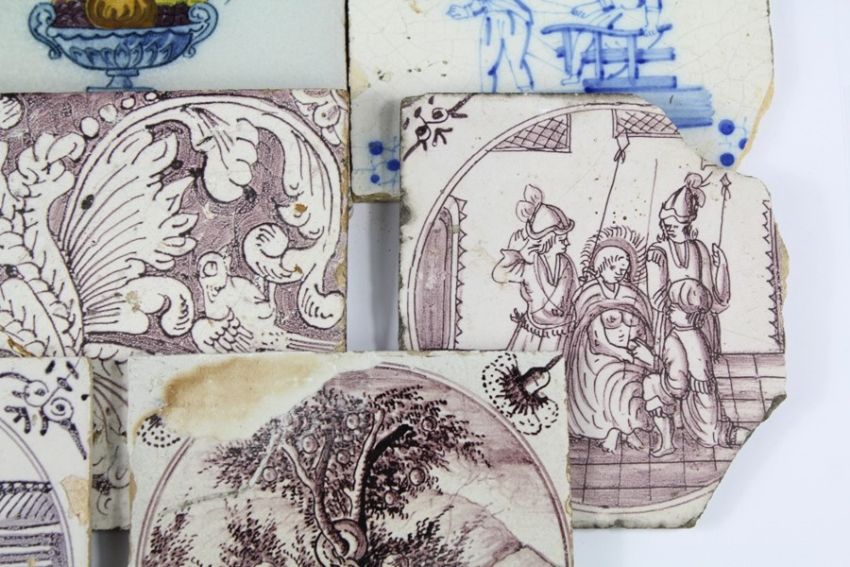 Eight 18th Century Delft Tiles. This lot includes five manganese and three blue and white, approx 13 x 13 cms, the tiles painted with both figural and foliate decoration.