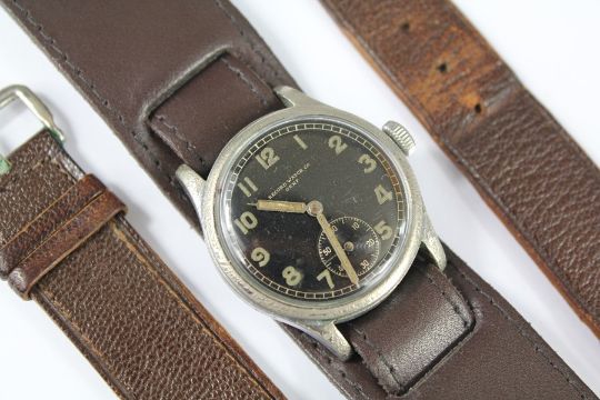 A German WWII Kreigsmarine Wrist Watch. The watch having a black numeric face with second dial. Eagle engraved to back numbered M47202.