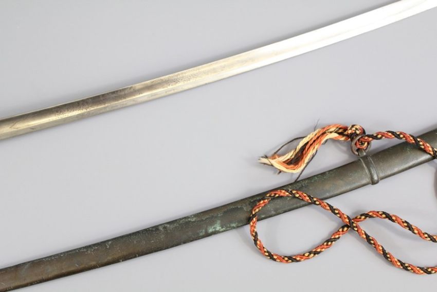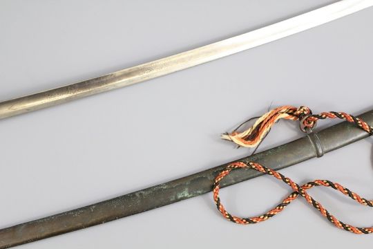 A Victorian Cavalry Officer's Sword. The sword with gilt knuckle, bow & royal cypher, wire-bound shagreen hilt, complete with scabbard.