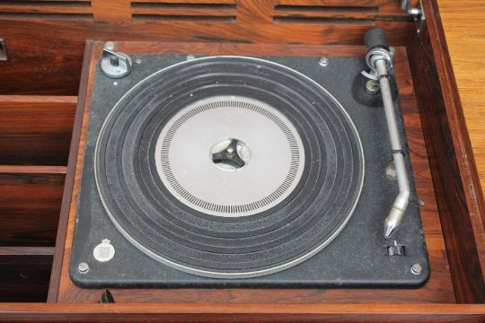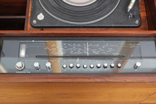 A Danish Retro Rosewood Music Cabinet. The cabinet contains a Bang & Olufsen Beomaster 1200 Radiogram and a B & O Turntable: the cabinet label reads "Danish Control Furniture Makers", approx 160 x 55 x 71 cms.