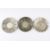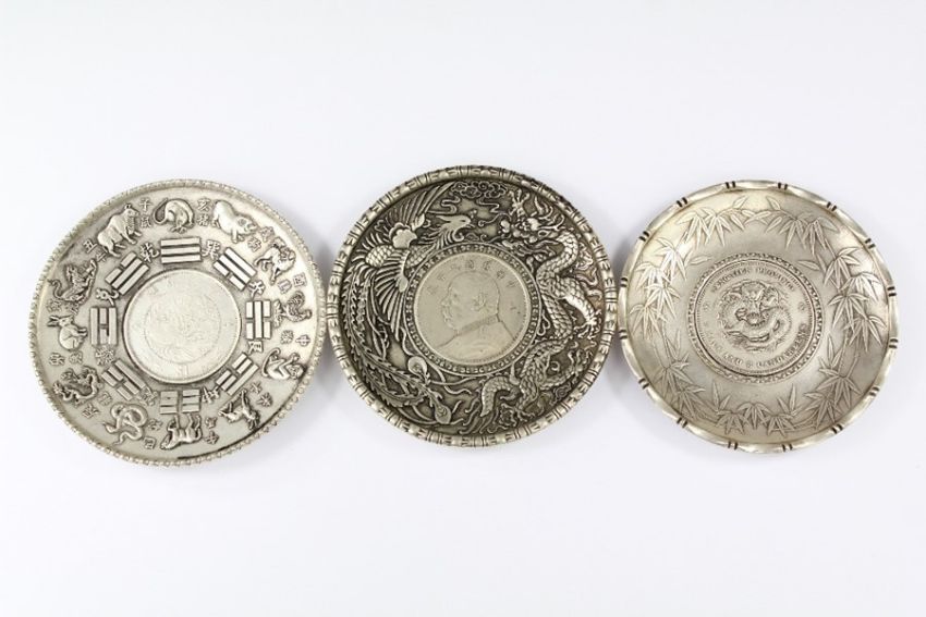 Three Chinese White Metal Pin Dishes. The dishes set with Chinese coins to the center and embossed with chasing dragon the outside border of one, bamboo leaf to the second and the Chinese horoscope to the third border approx 9.5 cms d.