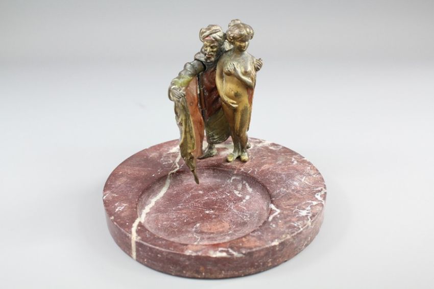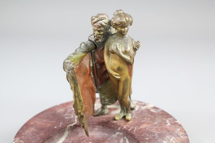 Early 20th Century Franz Bergman Bronze and Marble Ashtray. The cold cast bronze depicting a slave trader and girl, his mechanical cloak opens to reveal her nudity and closes to hide her modesty, with foundry mark to back, stamped 'Nam Gres', approx 41.5 cms h. (the bronze has separated from the marble base and will need re-pinning)