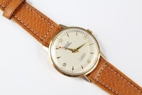 A Gentleman's Smiths 9ct Gold Astral Wrist Watch. The watch having a white face with both baton and numeric dial in the original box, weight with movement 30 gms.