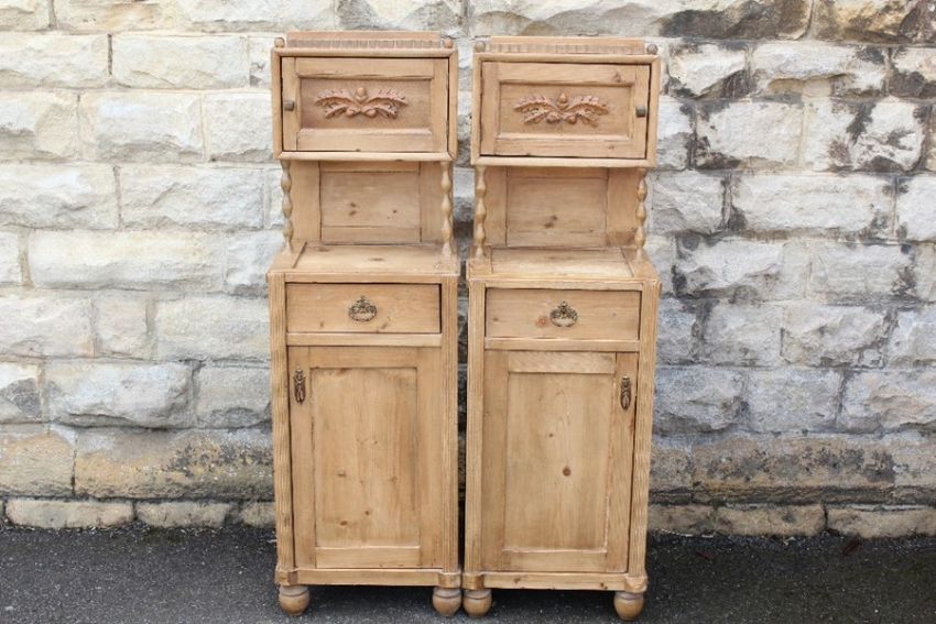 Two Single Pine Cupboards: the cupboards have a galleried top with carved door approx 40 x 17 x 45 cms, and a single shelf, beneath are two shelf cupboards approx 41 x 32 x 80 h.