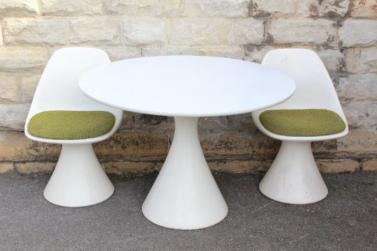 A 1970's Retro Cream "Arkana Bath GB" Round Garden Table: the table on central support bears an impressed mark Des Reg No, 937058 pattern no. 1170261, approx 109 cms dia  70 cms h, together with two tulip chairs.