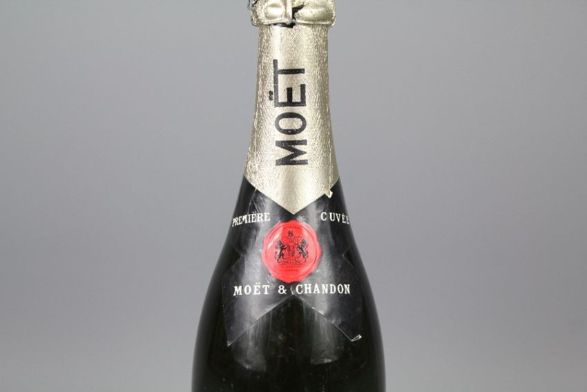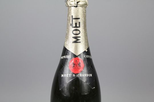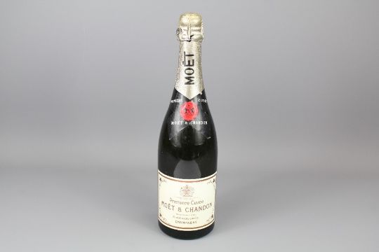 Bottle of Moet & Chandon Premiere Cuvee Champagne. The champagne label reads "Premiere Cuvee Maison Fondee en 1743, Finest Extra Quality Champagne" Product of France.