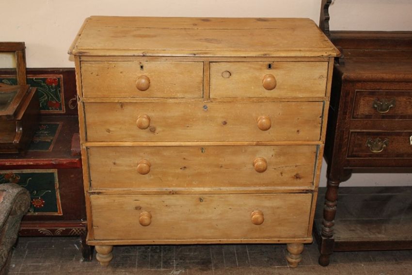 An Antique Stripped Pine Chest of Drawers: two short and three long drawers, on carved feet, approx 93 x 45 x 95 cms.