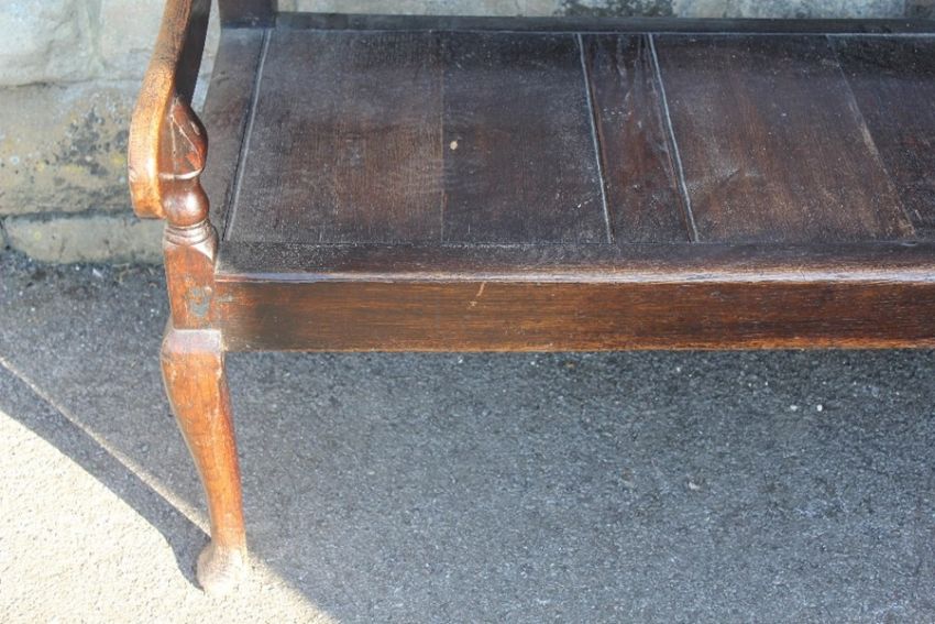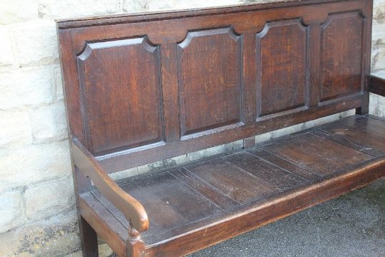 An Antique Oak Settle. The settle having a panelled back and on bun feet, approx 185 x 113 cms.
