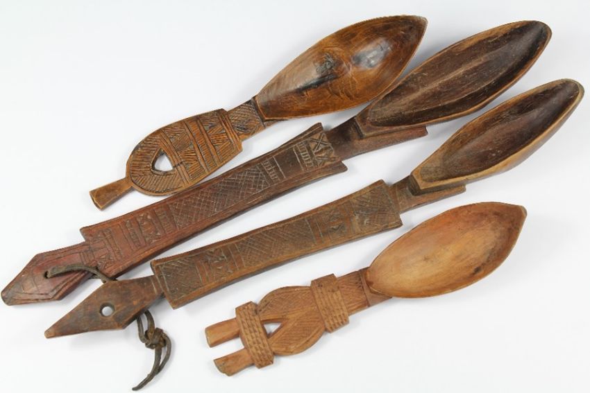 Four African Wood Carved Tribal Spoons. The spoons are understood to be from the Boni Tribe, they are hunters and gatherers that live in the Boni and Dodori Forest Reserves in the Lamu District Kenya. This lot includes two small spoons and two large.