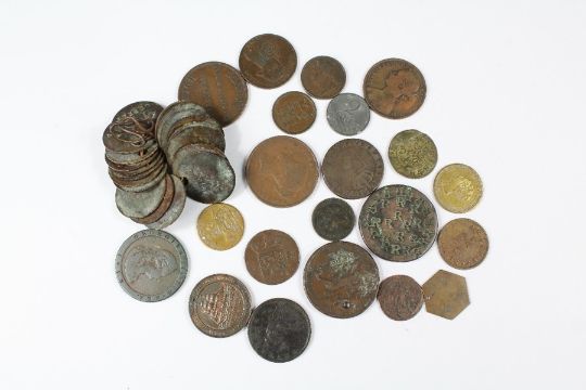 A Quantity of Antique Coins and Tokens, including a J.M Leigh Sydney Tobacconist, J Lackington Booksellers 1794, TM Smith St James Tavern, Wilsons Norwich 1839, antique hammered half penny and shilling and a bunch of Cofley tokens.