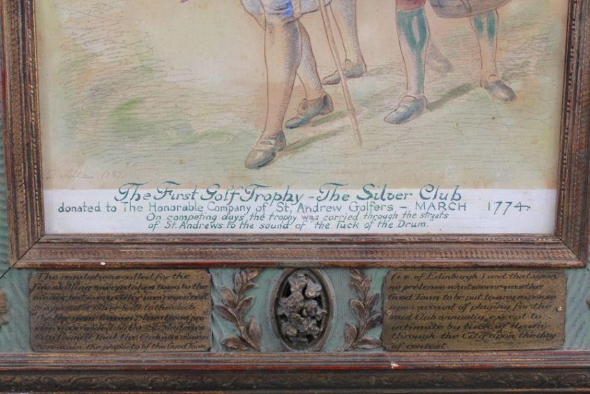 Scottish School Print, entitled 'The First Golf Trophy'. The silver cup donated to The Honorable Company of St Andrews Golfers March 1774, approx 24 x 32 cms, the print heightened with water-colour.