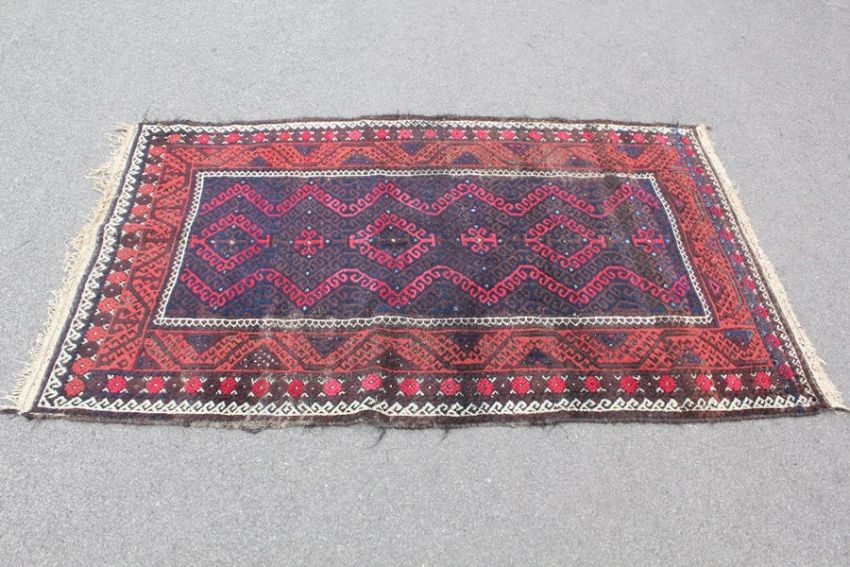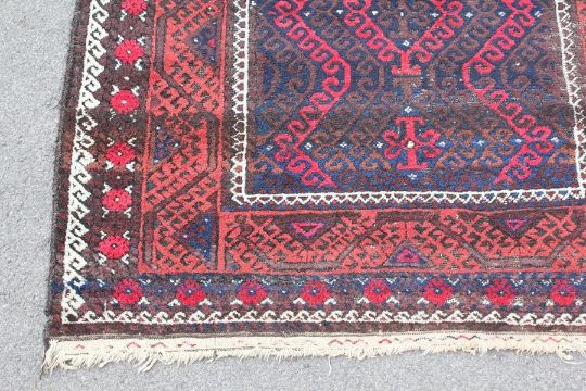 A Turkish Wool Carpet, claret ground with navy blue and cream geometric design, approx 115 x 200 cms, selvedges and tassels with some imperfection.