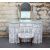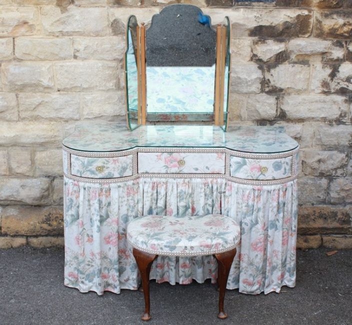 A "Dolly Varden" Kidney-shaped Dressing Table. The dressing table with stool and 3-piece bevelled mirror, shelves to left and drawers to the right with three drawers above, approx 118 x 56 x 76 cms.