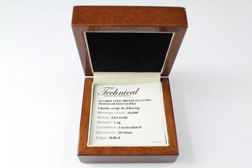22ct Gold 'Tristan da Cunha' Trafalgar Half Guinea, in the original box with certificate.
