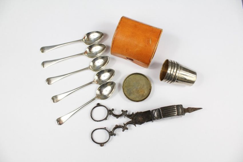 A Set of Four Communion Cups and Plates. The cups measure approx 3 x 3.5 cms and the plates approx 4.5 cms dia, in a neat leather pouch. together with a silver-plated wick trim and candle extinguisher and five coffee spoons. (3)