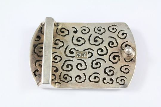 A Chinese White Metal Belt Buckle. The of rectangular form depicting a dragon with character marks, approx 7 x 4.3 cms.