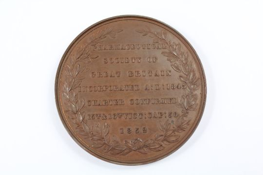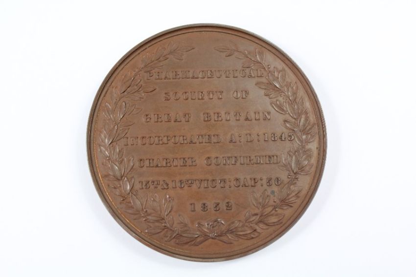 A Bronze Medallion. Inscribed with 'Pharmaceutical Society of Great Britain', dated 1852, approx 7 cms d, housed in the original W.J Taylor Medalist box.