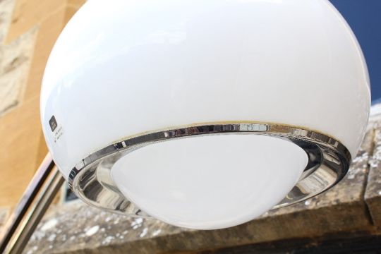 A Mid 20th Century Harvey Guzzini Arc Lamp. The arc lamp is one of the first made having a brass support and globular white shade, approx 250 cms l.