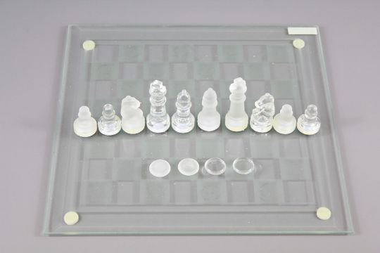 A Glass Chess Set. The set comprises board, chess pieces and drafts pieces.