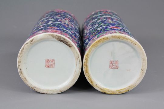 A Pair of 20th Century Chinese Pillar Vases. The blue and white vases depicting a bat design with pink floral strip to collar and base, approx 28 cms h x 12 cms dia.