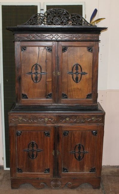 An Early 20th Century Chest on Chest. The top half having one shelf and double doors, lower half having two drawers above the one-shelf cupboard, floral metal decorations to all doors, on decorative bracket feet and floral carved cornice, approx 106 x 48 x 202 cms.