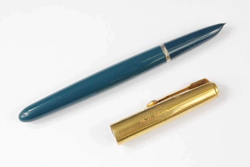 A Vintage Parker 51 Fountain Pen, with an 18ct hallmarked cover inscribed 'President Brand Goldmine' W.E.G. dated 14th September 1954, understood to be presented by Oppenheimer.
