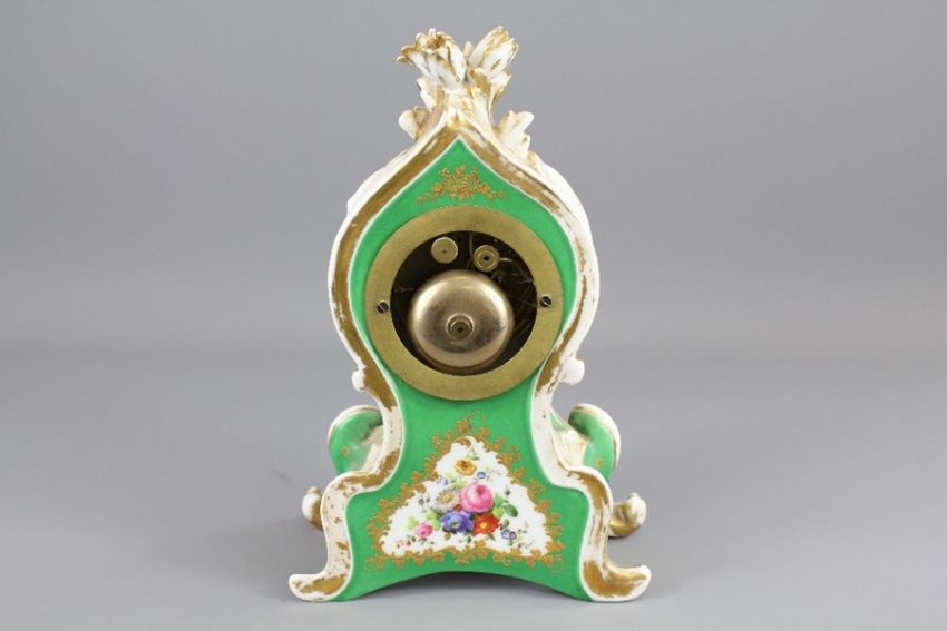 A 19th Century French Gilt Porcelain Mantel Clock. The clock having a enamel face with Roman dial, hand painted floral vignettes on green panels heightened with gilt, strikes to a bell, 8 day movement stamped Aubert & Klaftenberger Paris, approx 26.5 cms.